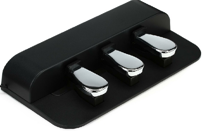 Тройной блок устанавливается непосредственно на пол и предоставляет полный функционал: soft (приглушение), sostenuto (сдерживание темпа), педаль экспрессии (sustain). Поддерживается демпферная функция, эффект полупедали: симулирование звучания акустического рояля при неполном нажатии педали. Блок педалей выполнен в черном цвете, педали – блестящие хромированные.